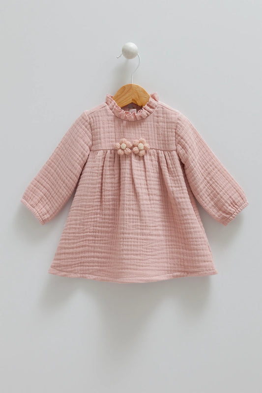 CHARMING LONG-SLEEVE BABY MUSLIN DRESS WITH RUFFLE NECKLINE - PINK, BEIGE & BROWN