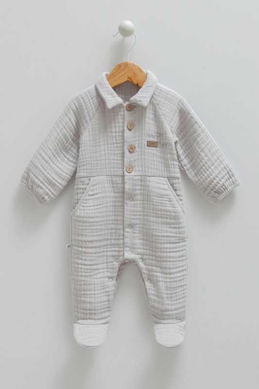 LIGHTWEIGHT CLASSIC BABY MUSLIN ROMPER WITH BUTTON-UP FRONT AND SNAP CLOSURE - BEIGE, GREY, NAVY & BROWN