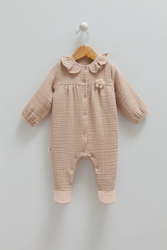 ADORABLE BABY MUSLIN JUMPSUIT WITH RUFFLED COLLAR AND SNAP BOTTOMS - PINK, BEIGE & BROWN