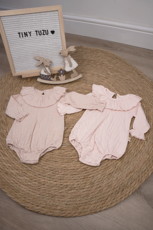 ADORABLE BABY MUSLIN JUMPSUIT WITH RUFFLED COLLAR AND SNAP BOTTOMS - PINK, BEIGE & BROWN