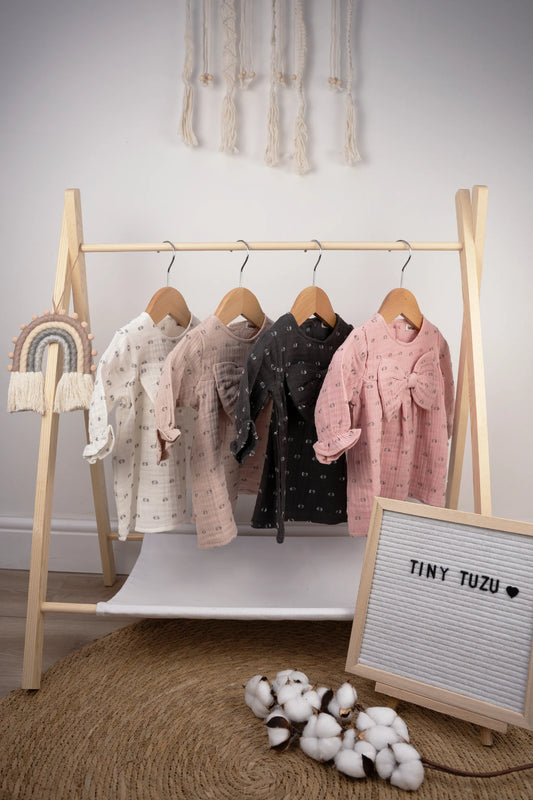 DELICATE BABY GIRL DRESS WITH BOW ACCENT - AVAILABLE IN CHARCOAL, WHITE, PINK, AND BEIGE