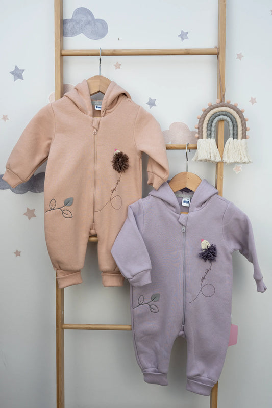 COZY HOODED BABY MUSLIN JUMPSUIT WITH SOFT INNER LINING AND ZIP CLOSURE - PINK, BEIGE & BROWN