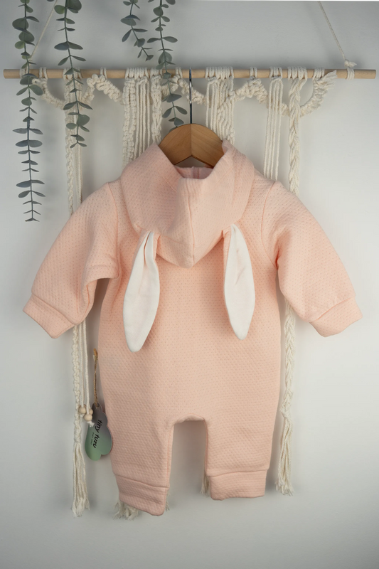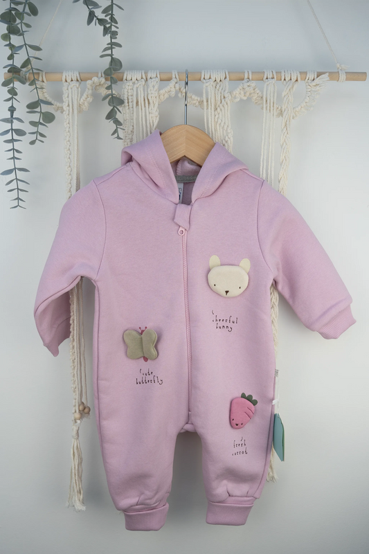 PINK & BEIGE HOODED BABY ROMPERS WITH 3D BUNNY, BUTTERFLY, AND CARROT DETAILS (0-12M)