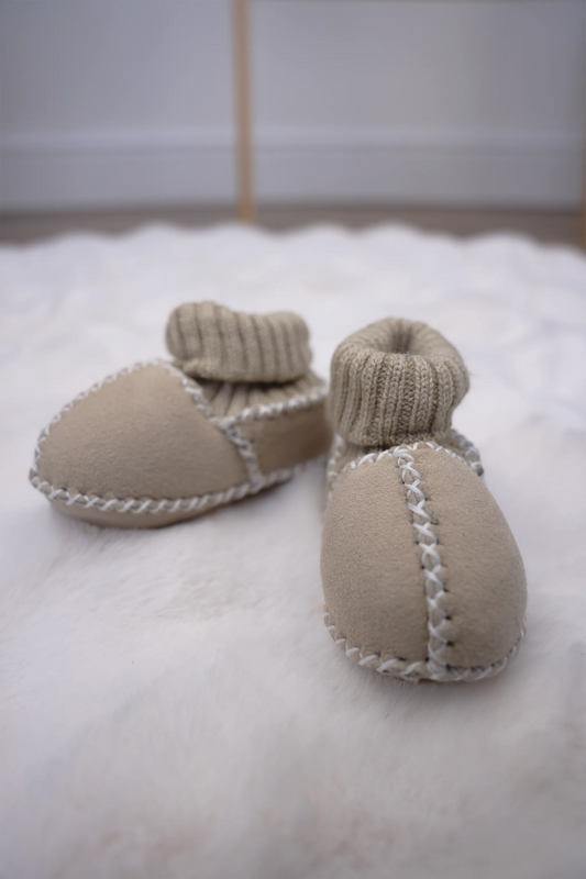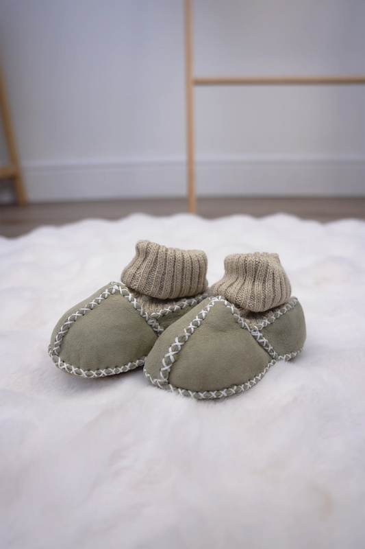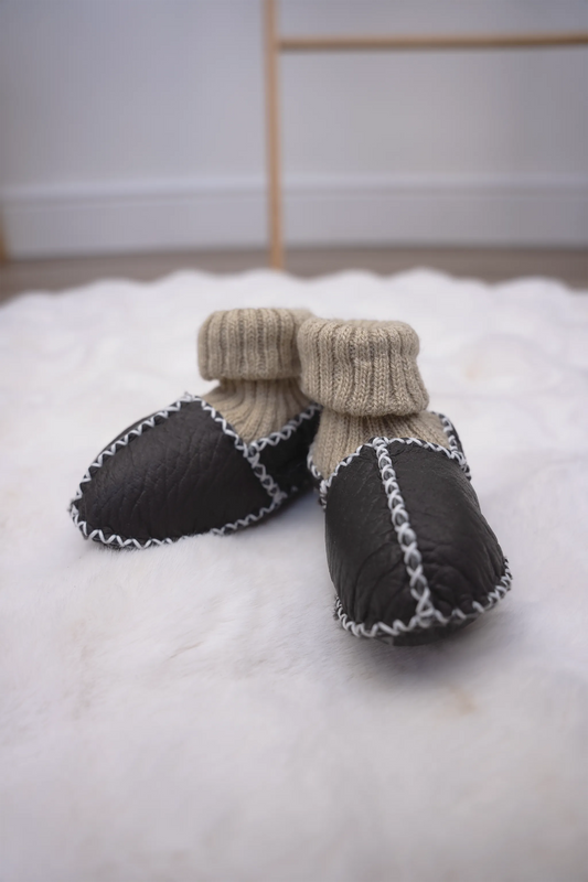 HANDMADE DOUBLE-FACED SHEEPSKIN BABY BOOTIES WITH KNIT CUFFS 0-6 MONTHS