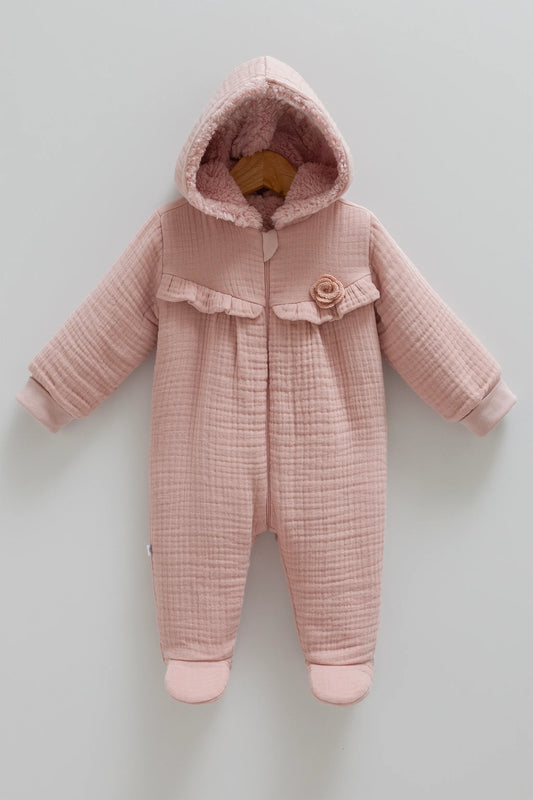 COZY HOODED BABY MUSLIN JUMPSUIT WITH SOFT INNER LINING AND ZIP CLOSURE - PINK, BEIGE & BROWN