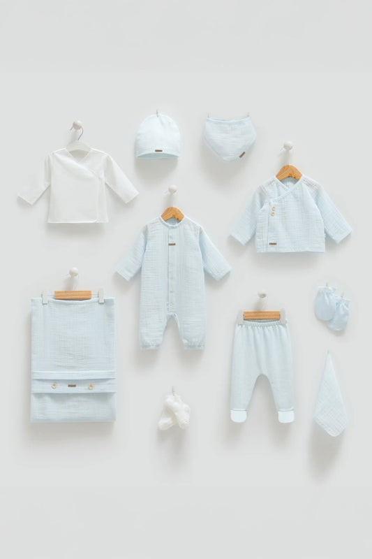 NEWBORN BABY 10-PIECE MUSLIN GIFT SET - BLUE & BEIGE