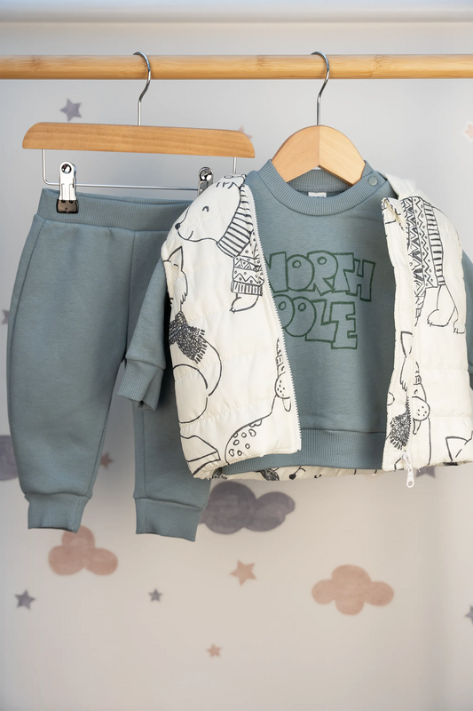 NORTH POLE ANIMAL-PRINT 3-PIECE QUILTED OUTFIT SET – BLUE & BEIGE (6-24M)