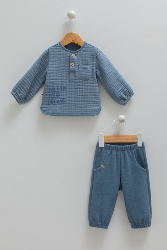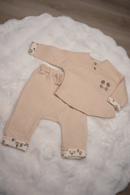 TWO-PIECE MUSLIN BABY OUTFIT WITH LONG-SLEEVE TOP AND COMFY PANTS - NAVY, BEIGE, GREY & BROWN
