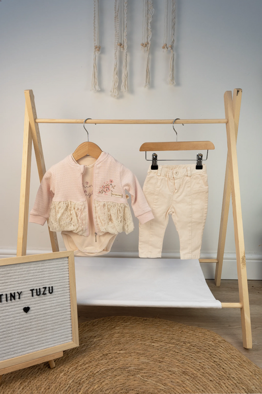 THREE-PIECE BABY GIRL SET WITH JACKET, BODYSUIT & TROUSERS – BEIGE & ROSE