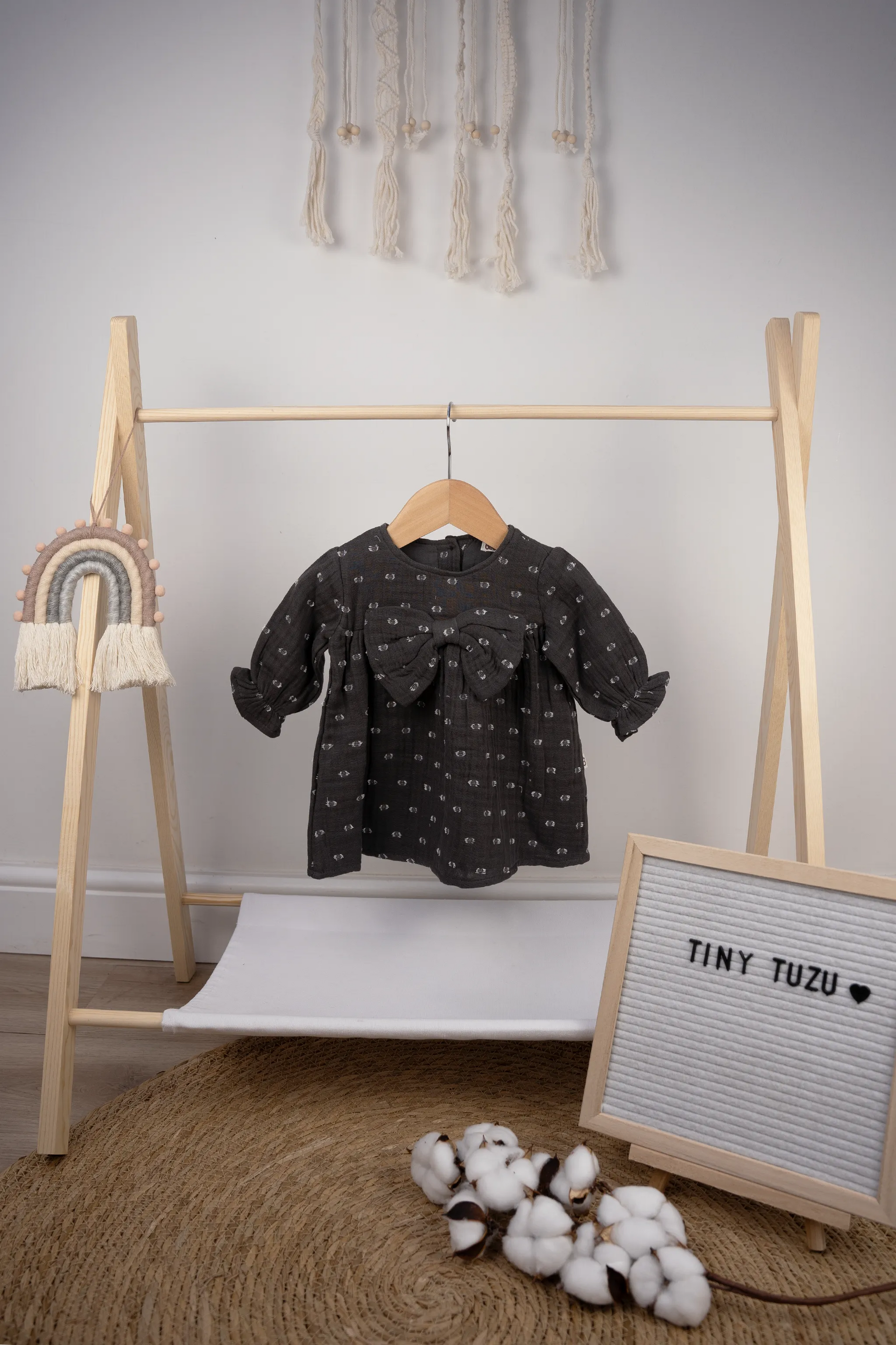 DELICATE BABY GIRL DRESS WITH BOW ACCENT - AVAILABLE IN CHARCOAL, WHITE, PINK, AND BEIGE